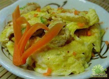 2)雞蛋裡加一點鹽打散。鍋熱油,下薑末蔥絲,炒出香味以後,倒入魚片。
