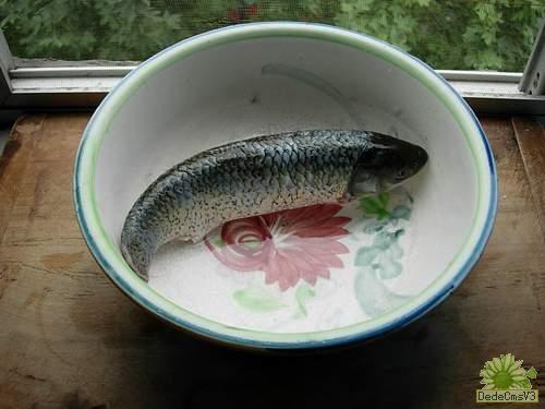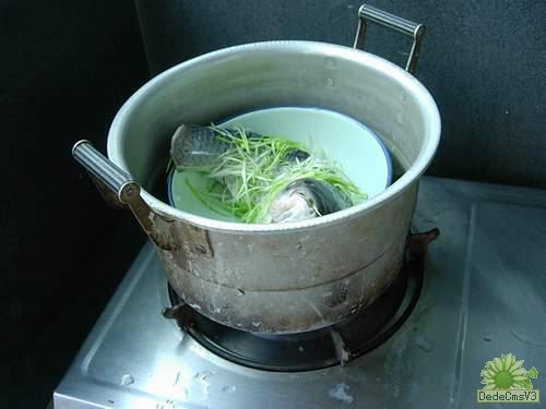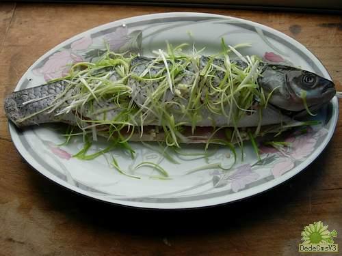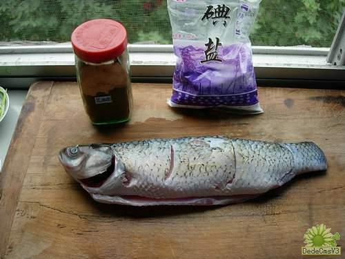 7、除鹽和花椒粉外,還要在魚的腹腔 頭部 切開的刀花處放上蔥,這樣清蒸的時候才可以出去腥味