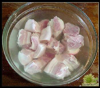 將肉切成麻將牌大小正方形的塊,肉不要切得太小,太小易縮易碎,沒有賣相了。切完後,用冷水浸沒,水中放半杯料酒。放在水中浸,可以浸去毛細血管中的血水;水中加酒易於肉纖維吸收,去除肉腥。肉不宜多浸,多浸則鮮味盡失,一般浸十五分鐘左右即可。