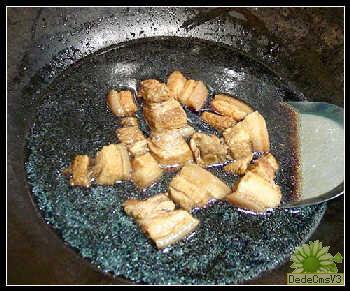 肉要燒得用筷輕戳可通,然後換到鐵炒鍋裡,不加蓋燒,這時加入老抽和鹽,小火繼續燉。半個小時後轉中火加糖。隨時輕翻,待到收汁,稍微粘稠即可。